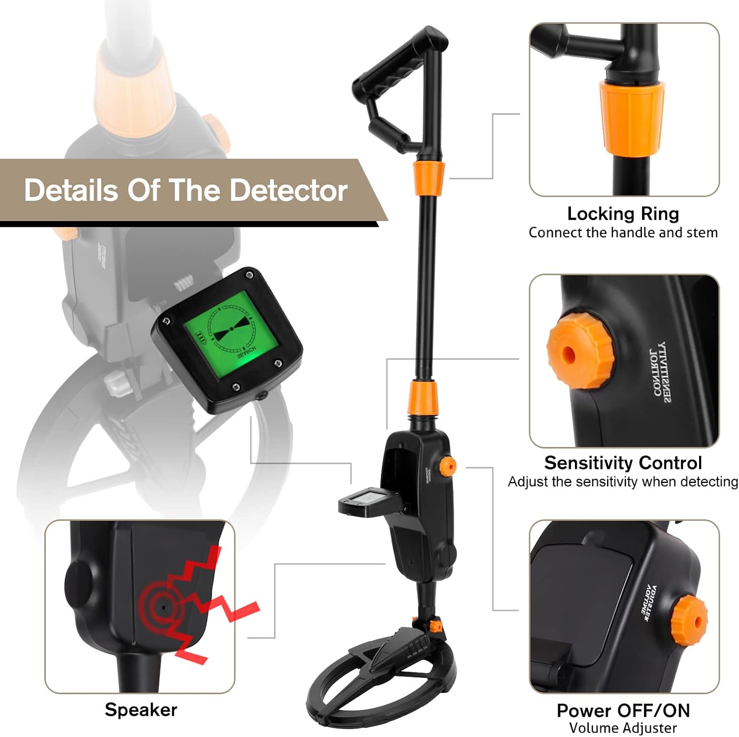 Acerca de este producto [Sensibilidad y Volumen Ajustables]: El nivel de sensibilidad y el volumen de los detectores de metales para niños se pueden controlar fácilmente con el botón de control; el detector de metales es adecuado para encontrar monedas, joyas y otros objetos metálicos perdidos (clavos de hierro, láminas de hierro, anillos de aluminio, pequeños productos de aluminio, monedas, oro, cobre, plata), muy adecuado para la detección en diversos entornos [Indicación de LCD y SONIDO]: La pantalla LCD muestra el nivel de la batería, lo que le permite saber cuándo es el momento de reemplazar la batería; en el estado de búsqueda, la pantalla LCD mostrará que está buscando, sin sonido; cuando se encuentra metal, nuestro detector de metales para niños emitirá una alarma de audio, la pantalla mostrará «METAL FOUND», la operación es muy simple [Bobina de Búsqueda a Prueba de Agua]: Este detector de metales para niños usa una bobina de detección a prueba de agua para garantizar la eficiencia de detección en el agua, puede usar la bobina de búsqueda a prueba de agua para usar el detector de metales en aguas poco profundas, solo use una batería de 9V para trabajar durante mucho tiempo ; Cuando deje de funcionar, quita la batería [Ligero y Portátil]: Este detector de metales para niños es liviano, fácil y cómodo de operar y fácil de transportar; este producto está especialmente diseñado para principiantes y niños y se puede utilizar en muchos escenarios, ideal para actividades al aire libre como mar, playa, arroyos, etc [Detector de Metales Seguro para Niños]: Este detector de metales liviano para niños es el regalo perfecto para los niños, el detector de metales está hecho de material ABS, no hay absolutamente ningún riesgo para sus hijos; disfrute del tiempo libre con sus hijos, encienda Treasure Hunt
